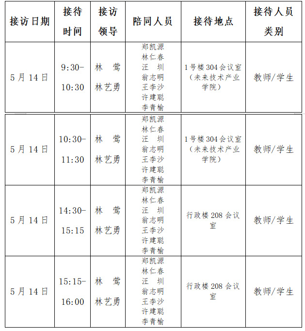 下午学生专场:由各二级学院(不含未来技术产业学院)各派2名学生代表参加活动,学生代表应具有一定的代表性,该环节以学生座谈方式进行。请各单位提前收集本单位人员的意见建议,在学生专场到行政楼208会议室进行反馈,未被安排的学生也可自行向党委办公室进行登记。